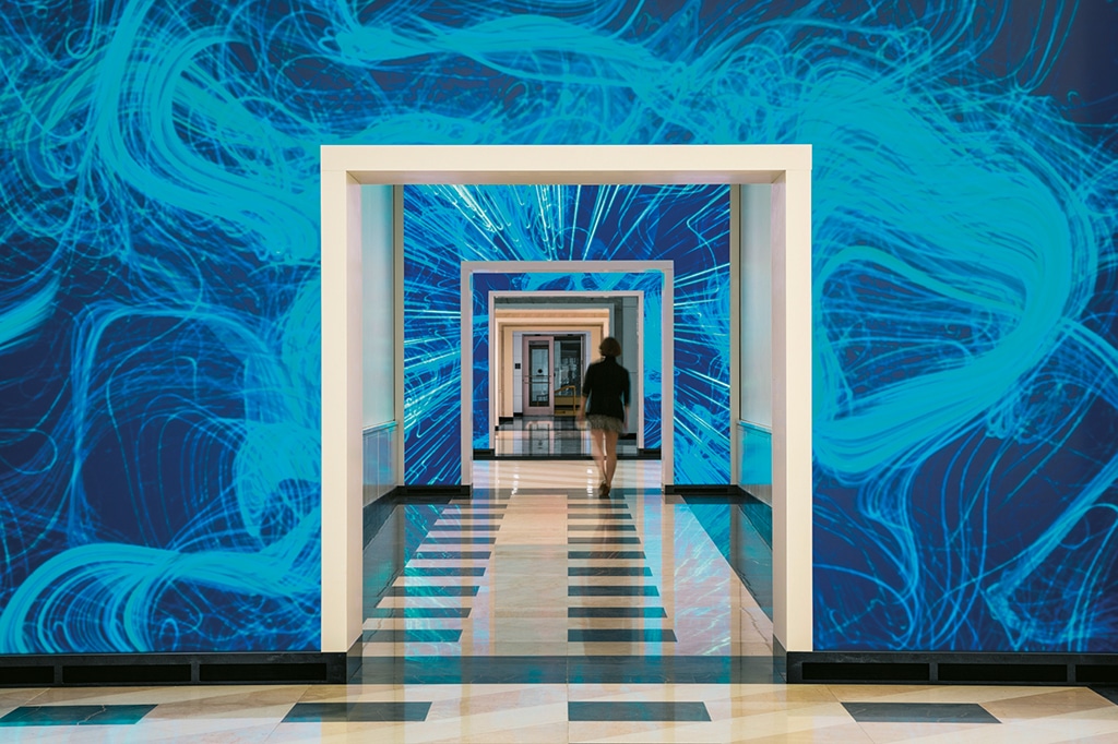 So konzipierte das renommierte Designerteam interaktive Bildwände für den Foyer- und Korridorbereich. Heute werden die Besucher des Terrell Place im Rahmen unterschiedlichster medialer Szenarien wie einem feuerwerksartigen Farbenspiel oder inmitten der vier Jahreszeiten empfangen.