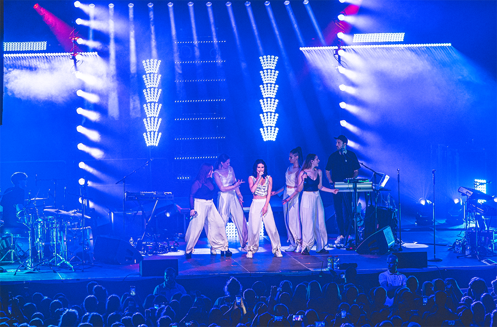Die X4 Bar, eines von JoJos „Lieblingslichtwerkzeugen“, ordnete er wie die Sprossen einer Leiter übereinander an und platzierte die Konstruktion direkt hinter dem Podest. „So wirkten die einzelnen Bars wie ein großer Lichtspiegel“, erklärt er. Grundsätzlich sei die X4 Bar „der Hit und ein wirklich einzigartiges Fixture“. Kaum ein Lichtdesign kommt ohne die vielseitigen LED-Bars aus. Eingefasst wurden die Bars von zwei vertikalen Säulen aus jeweils sechs GLP KNV Arc links und rechts. „Diese Anordnung tauften wir liebevoll die ‚Palme‘“, erinnert sich der Designer.