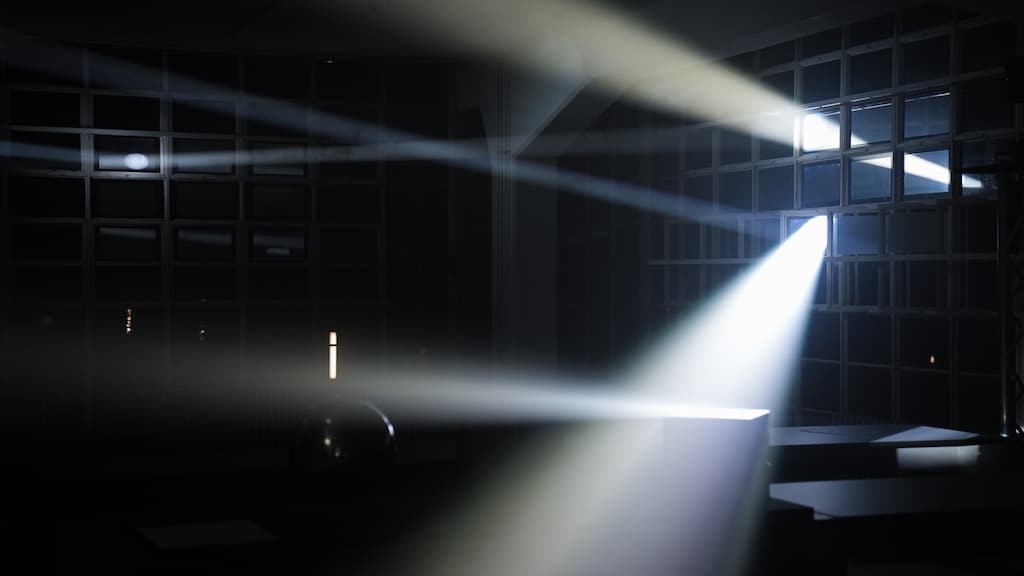Also beklebte der Künstler die Fenster zunächst mit Spiegelfolie und stattete den Raum mit Fusion Exo Beam Scheinwerfern von GLP aus. Die Lichtstrahlen aus den kompakten Scheinwerfern wurden von den Fenstern reflektiert, und wann immer das Publikum die Fenster durch Zug an der Kette öffnete, veränderte dies auch die Reflexion des Lichts im Raum. Das Besondere hierbei war das Zusammenspiel der manuellen Bewegung der Fenster durch das Publikum auf der einen und der automatisierten Scheinwerfer auf der anderen Seite, die durch interaktive Algorithmen auf die Ausrichtung der Fenster reagierten.