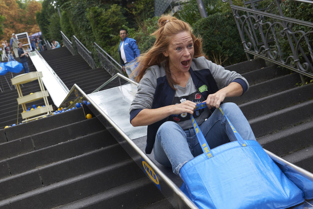 Die Treppenrutsche: Der eine oder andere Erwachsene hat beim Besuch eines Ikea vielleicht schon neidisch zum Bällebad des „Småland“ rübergeschaut. Für alle, denen es so geht, hat Ikea jetzt die circa 60m lange Treppe an der Buchenstraße zur Rutsche umfunktioniert – komplett mit einem Fahrtende im erwachsenengerechten Bällebad. Die Treppenrutsche wurde von Razorfish mit einer Facebook-Live-Übertragung am 17.9. um 9:30 Uhr eröffnet. Moderator Lukas Klaschinski füllte mit Hilfe der Ikea-Facebook-Fans in witzigen Aktionen die letzten Bälle ins Bällebad.