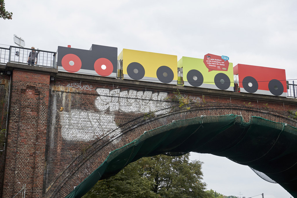 Der Spielzug: Auf dem Viadukt an der Westkotter Straße bringt Ikea die Eisenbahn auf die stillgelegte Nordbahntrasse zurück und vor allem kleinen Wuppertalern einen Grund zum Freuen. Denn die Bahn kommt in Form einer übergroßen Ikea Lillabo-Eisenbahn daher, einem beliebten Holzspielzeug für Kinder. Auf der Rückseite der Wagons finden sich Kinderrätsel.