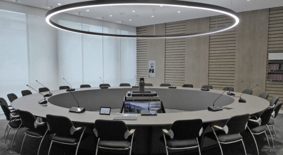 Damit die Kameras während der Konferenz die Sprechenden fokussieren, wählte man mit Extron-Mediensteuerung und PTZ-Kameras von Panasonic. Die Kameras schwenken automatisch zu den aktiv Sprechenden, können Gesichter fokussieren und wechseln zwischen passenden Bildausschnitten oder vorab programmierten Presets wie zum Beispiel einer Totalen oder dem Fokus auf eine bestimmte Person im Raum. Die Kameras und alle weiteren Steuerungselemente gliedern sich unauffällig im von PCS konzipierten Medienwürfel ein, welcher in der Mitte des runden Konferenztisches seinen Platz findet. Dabei bleiben auch alle Kabelführungen verborgen.