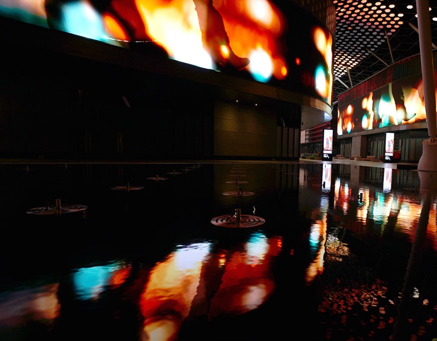 Das Ganze entwickelte sich zu einem digitalen Outdoor-Erlebnis, das mehr als 30 LED-Installationen, fast 30 Projektoren und eine Wasserfontänen-Show mit Wasserleinwänden umfasst. Insgesamt wird eine Fläche in der Größe von 12 Fußballfeldern mit über 100 Millionen Pixeln bespielt.