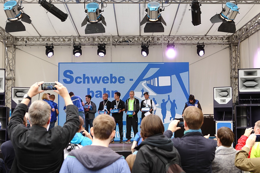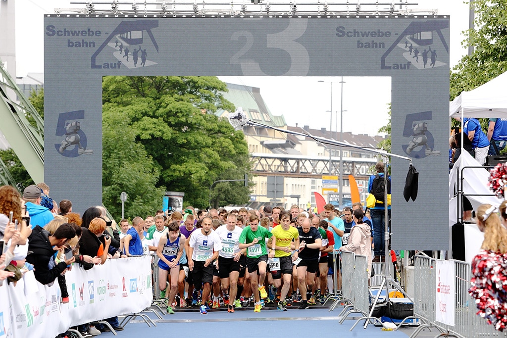 Beim Wuppertaler Schwebebahnlauf rahmten zwei LED-Portale die Start/Ziel-Positionen des Schwebebahnlaufes publikums- und bildwirksam ein. Innlights Displaysolutions hatte diese speziell geformten LED-Displays und ein weiteres Display für die zentrale Bühne geliefert und installiert.