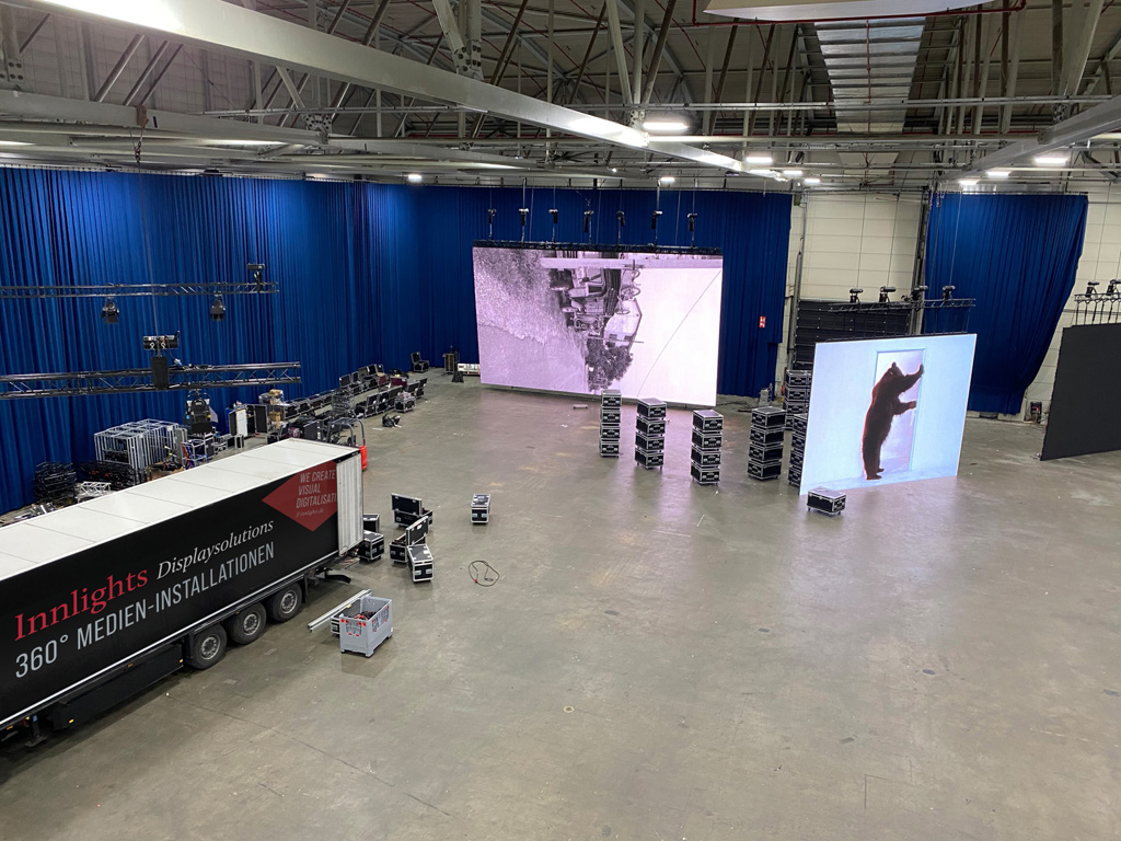 Die jeweils nur 3,4 Tonnen schweren LED-Displays hatte das Wuppertaler Unternehmen Innlights Displaysolutions geplant, statisch berechnet und für die Partnerfirma Vidi Square aus Belgien installiert. Zum Einsatz kam das LED-Panel Inn Screen R3 HE mit 3,9 mm Pixel Pitch, welches bereits auf diversen internationalen Großevents, wie bspw. den Pan American Games 2019 in Peru, zum Einsatz gekommen ist. Die LED-Charge umfasst 1.000 m² und sei laut eigener Aussage somit eine der größten 3,9 mm-Batches für den Indoor-/Outdoor-Einsatz im europäischen Markt.