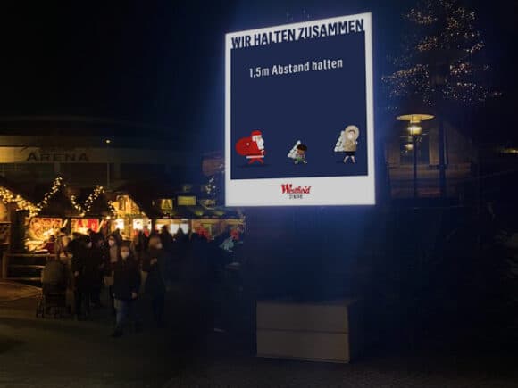 Mit dieser Technik erstrahlten im Centro Oberhausen zur Weihnachtszeit vier LED-Pylone im Format von 2 x 2,5 Meter auf der „Promenade“. Dargestellt wurden schwerpunktmäßig Corona-Hinweise für die Besucher:innen. Informationen zur Entfluchtung der Einkaufsmeile waren für denkbare Notfälle zusätzlich vorbereitet und jederzeit zuspielbereit.