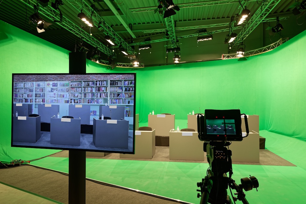 Bei einer Greenbox wird mithilfe der Greenscreen-Technik virtuell eine Umgebung erzeugt, die auf Betrachter am Bildschirm authentisch wirkt. Die farbbasierte Bildfreistellung ist ein etabliertes Verfahren aus der Film- und Fernsehtechnik: Gegenstände oder Personen können vor beliebigen Hintergründen positioniert werden, welche entweder auf realen Bild- bzw. Filmaufnahmen (beispielsweise hier eine auf Kundenwunsch gefertigte Bibliothek) oder auf Computergrafiken (wie bei den allseits bekannten Nachrichtensendungen) basieren. 3D-Renderings in Echtzeit dienen in diesem Zusammenhang als besondere Blickfänger.