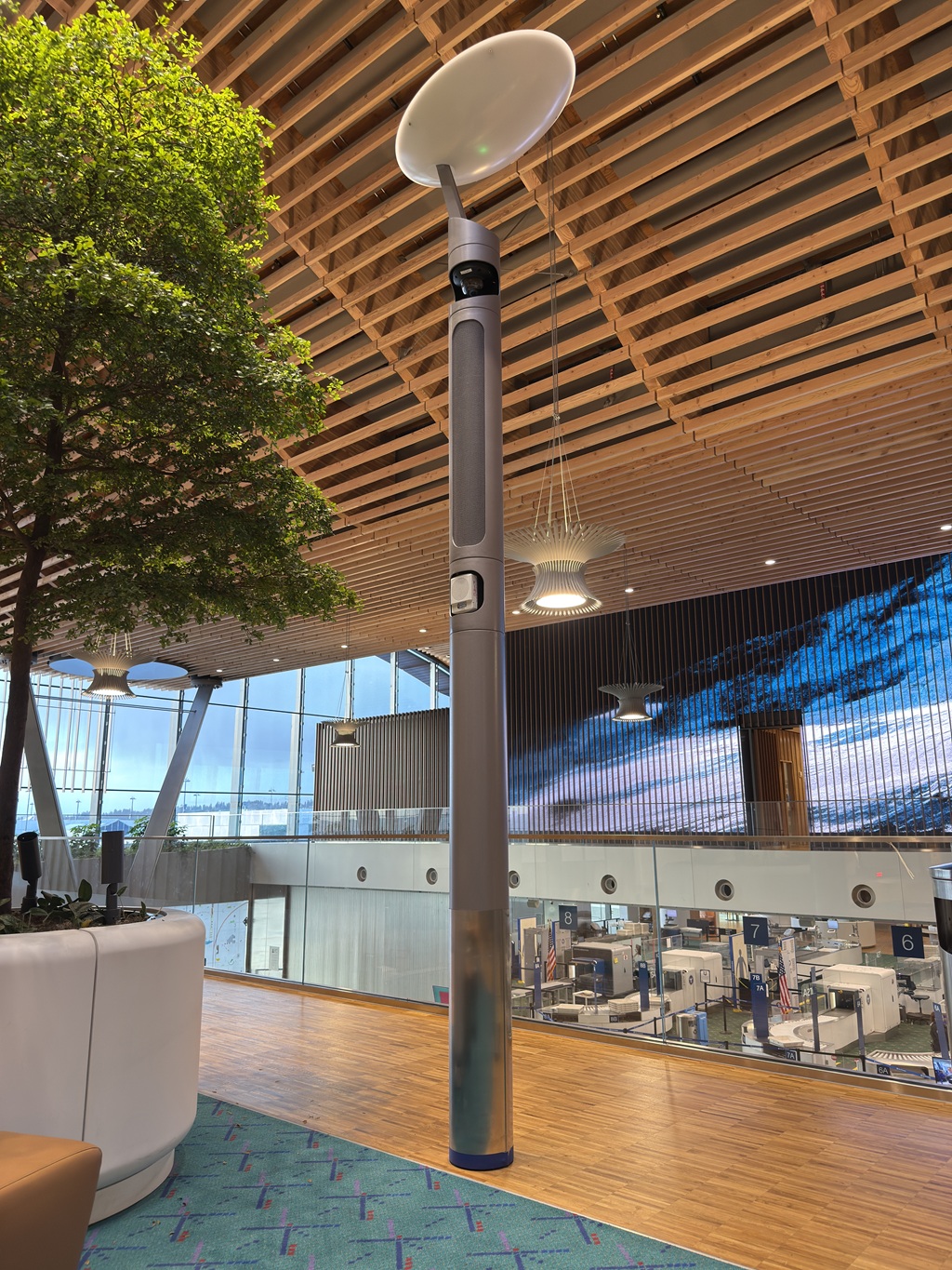 „Die größte Herausforderung war das Fehlen von Wänden oder Decken zur Befestigung der Geräte“, erklärt Ryan Lalum, Senior Associate bei PAE. „Das offene Design des Terminals sollte die freie Natur nachahmen, ohne dass eine herkömmliche Infrastruktur zur Verdeckung der Lautsprecher vorhanden war. Daher mussten wir eine innovative Lösung entwickeln: die Integrated Technology Poles.“