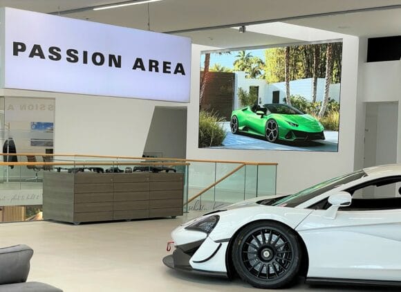 Als jüngsten Beitrag installierte der Bielefelder Systemintegrator Medientechnik Bentlage in Zusammenarbeit mit dem Leyard Distributor tvd Trans Video Deutschland Vertriebs GmbH eine Leyard TVF Series LED-Videowand in der „Passion Area“ des Autohauses. Mit der Darstellung hochwertiger Bewegtbilder soll die ca. 4,8 x 2,8 Meter große Videowand das Markenerlebnis während der Öffnungszeiten unterstützen oder als Präsentationsfläche bei sonstigen Veranstaltungen dienen. Die insgesamt 64 (8×8) Cabinets vom Typ TVF1.8 bieten eine Gesamtauflösung von 2560×1440 Pixel (16:9 Format) mit einem Pixelabstand von 1,8 mm. Auch bei reduzierter Helligkeit biete die LED-Wall eine gute Bildqualität und hohen Kontrast in der hellen Umgebung des Autohauses, wozu auch die reflexionsarme Oberfläche der LED-Module beitrage.