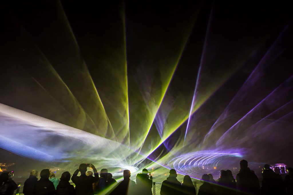 DS Showlaser projizierte Farben und Bilder in die Umgebung und ließ das Gelände in einem ganz besonderen Licht erstrahlen. Die Abschlussveranstaltung wurde von mehr als 8000 Besucherinnen und Besuchern begeistert gefeiert. Natürlich spielte auch Musik eine wichtige Rolle, die die Bilder komplettierte. Bei der Lasershow galt es einige klangliche Herausforderung zu meistern. Es musste ein Areal von 8000 m² gleichmäßig beschallt werden. Die Laufzeiten des Klangs mussten zu allen Zuhörern gleichmäßig (gering) sein, da die Musik synchron mit den Bildern und Lasern zu hören sein sollte. Die genaue Positionierung und die Einrichtung der PA war dabei ausschlaggebend für eine gleichmäßige Beschallung.