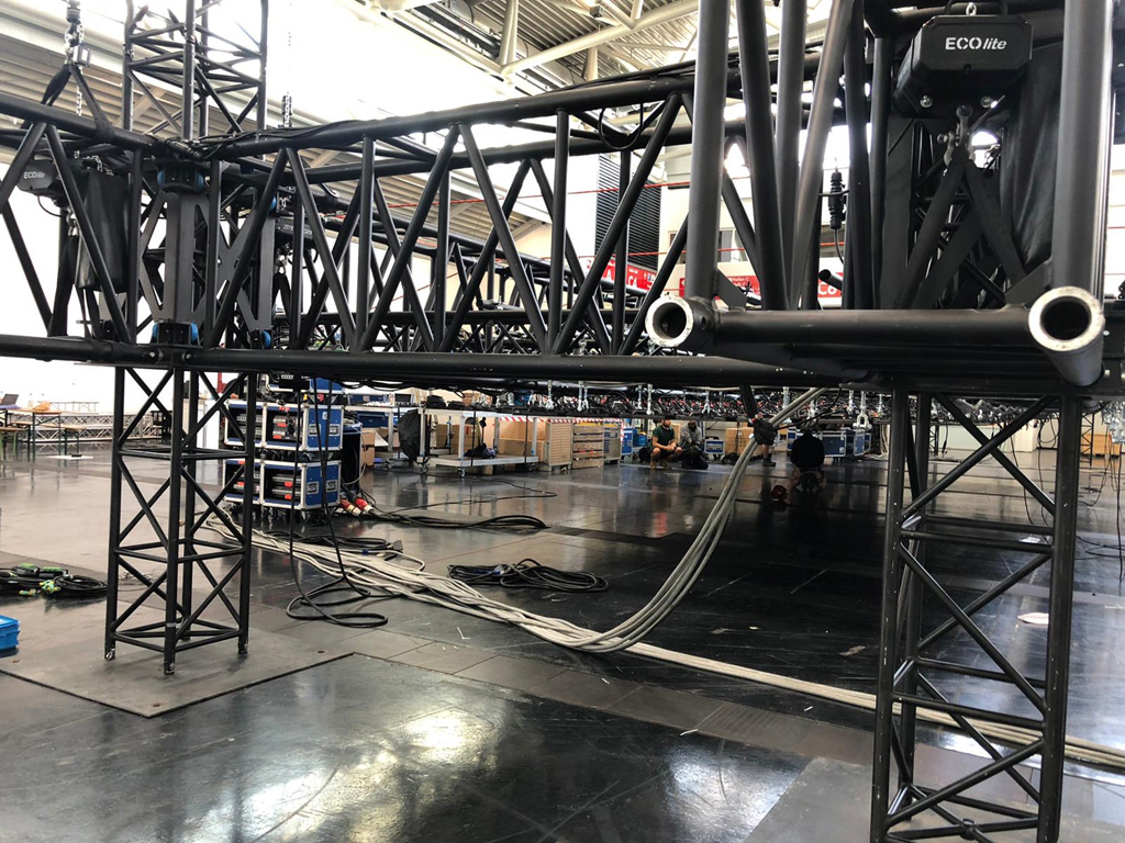 Oberhalb der LED-Wand ist eine LED-Decke, die ebenfalls aus Diamon DM 2.6 Panelen besteht und von einer Truss-Konstruktion gehalten wird. So soll eine nahtlose LED-Umgebung erschaffen werden.