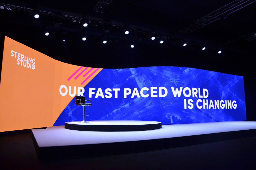 Hinter der Bühne befindet sich ein gebogener 16×3 m LED-Screen als dynamischer Backdrop. Er besteht aus den Polaris 2,5 mm Pro von Absen, die mit 1200 Nits Helligkeit laut eigener Aussage speziell für die Indoor Nutzung entwickelt wurden. Im Sterling Studio wird der Screen für simultane Präsentationten, das Anzeigen von Social Media Feed sowie Werbehintergründe verwendet.