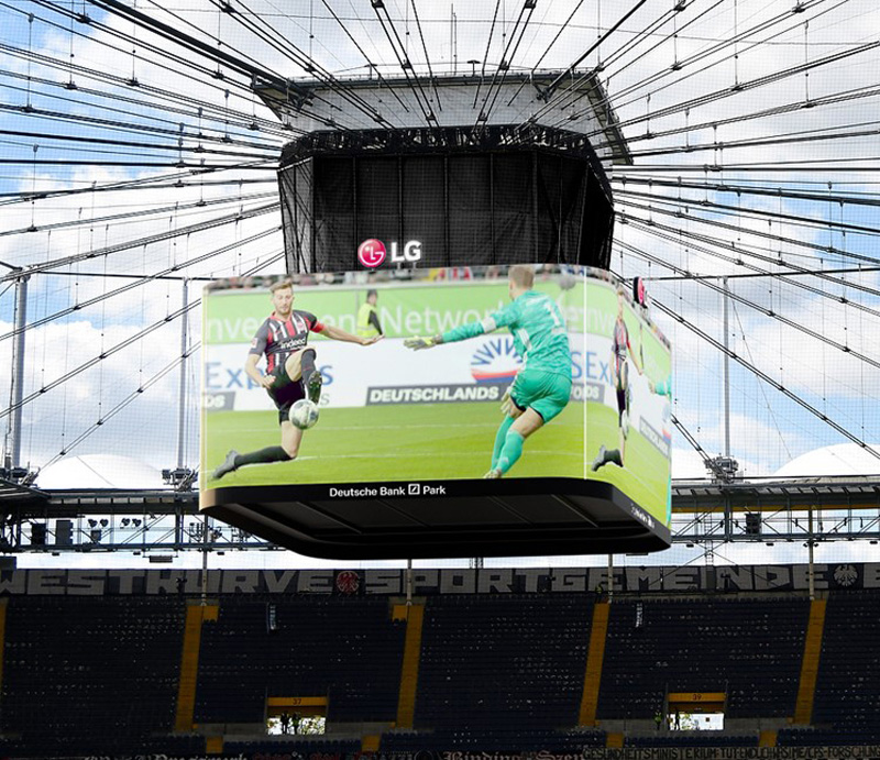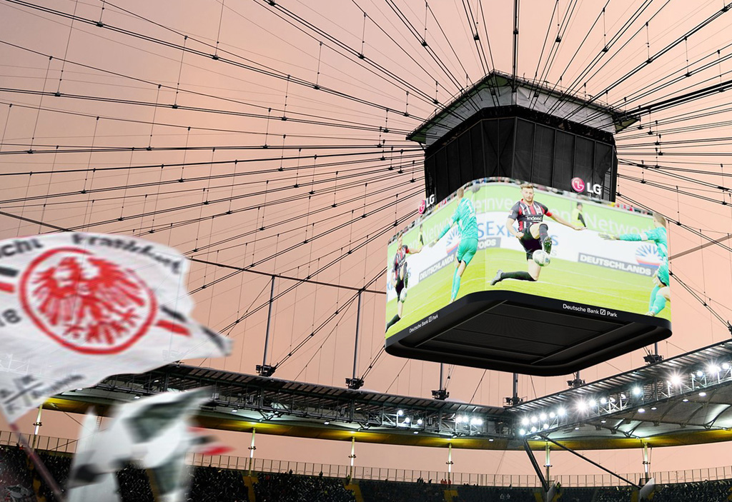 Wenn der Ball im Frankfurter Stadtwald wieder rollt, erleben die bis zu 51.500 Fans von Eintracht Frankfurt und der Gastmannschaft im jüngst neu getauften Deutsche Bank Park jedes einzelne Tor auf dem neuen LG-Videowürfel.