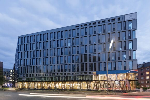 Wie ein Schiffsbug erhebt sich das Eckhaus aus dem urbanen Gewebe der Wohngegend. Markante, V-förmige Stützen sollen das Erscheinungsbild des Sockelgeschosses durch seine Glasfassade nach außen ebenso prägen wie das Raumgefühl im Inneren. Der Eingangsbereich in doppelter Geschosshöhe an der Gebäudespitze unterstreiche den Eindruck.
