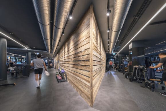 In diesem Rahmen gestalteten die Clubbetreiber unterstützt durch Thomas Hess von Plan A Architekten aus Frankfurt eine Innenarchitektur, die das Corporate Design der Kette weiterentwickelt. Oberflächen wie Böden und Decken sind in einer dunklen Graupalette angelegt, damit kontrastieren die silbernen Metallrohre der offen an der Betondecke montierten Lüftungstechnik sowie Wandverkleidungen und Einbauten aus Holz. Die Trainingsgeräte sind einheitlich dunkel lackiert und mit honigfarbenen Sitzbezügen ausgestattet.
