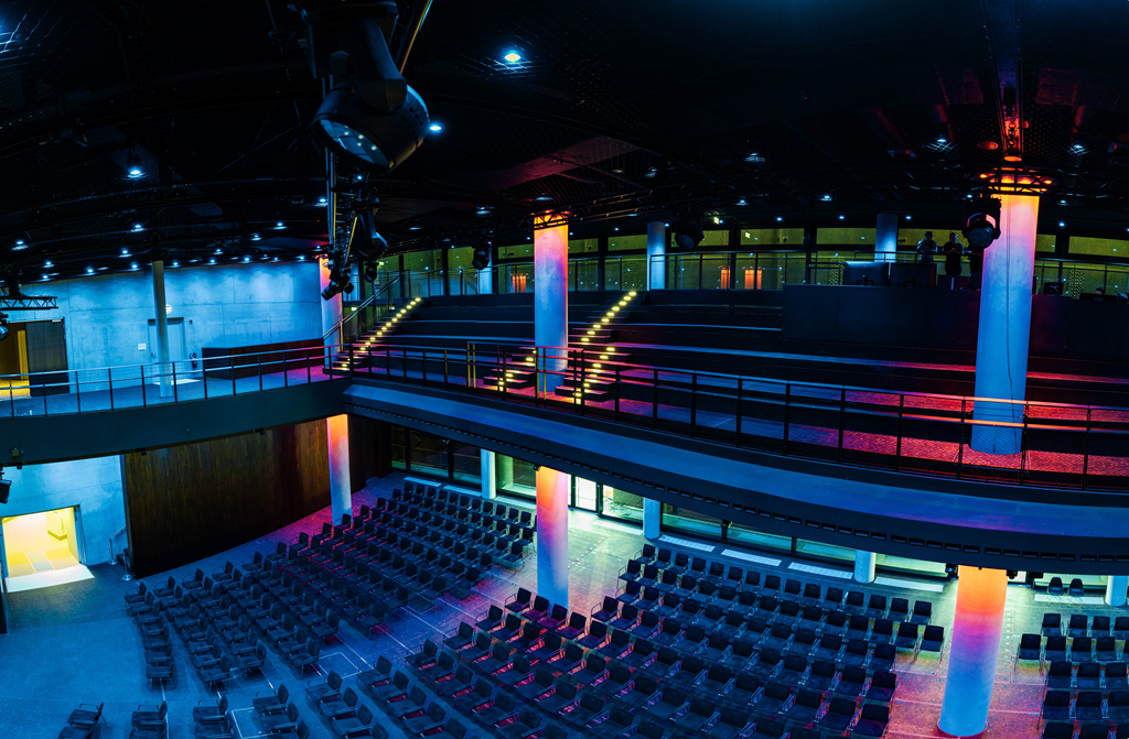 Die Lichtinstallationen im Saal-, Foyer- und Konferenzraumbereich sind auf den besonderen architektonischen Charakter des Gebäudes abgestimmt. Dazu werden unter anderem die Säulen mit Farbe beleuchtet. (Bild: VisionTwo GmbH / PIK AG_Forum )