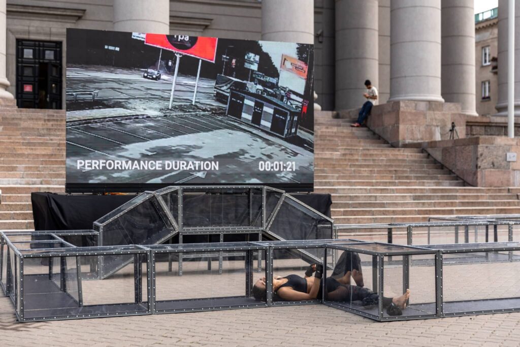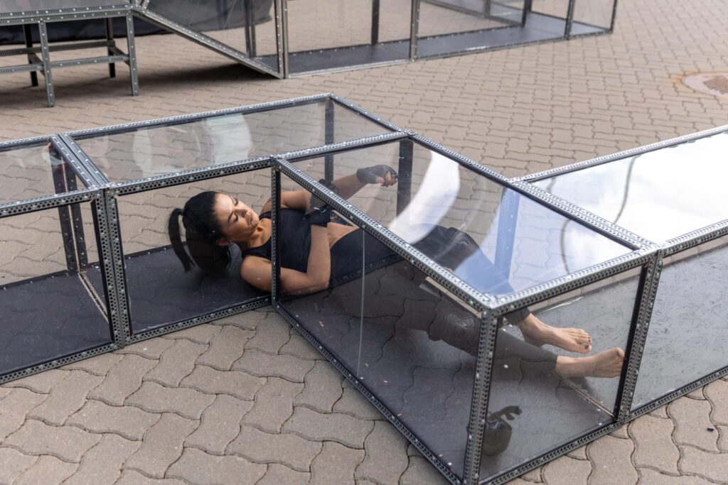 Ein gläsernes Labyrinth, in dem eine um ihre Existenz kämpfende Person eingeschlossen ist, sollte eine globale Arena der Gegenwart darstellen, in der die ukrainische Nation zusammen mit allen zivilisierten Ländern dem Aggressor Widerstand leistet, der versucht, den Begriff des Menschseins zu vermindern und vernichten .