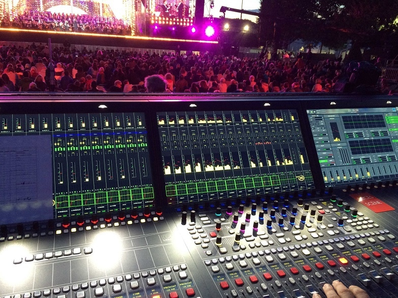 Angebunden über MADI an die Nova37 war auch ein zusätzlicher Yamaha DM1000 Mixer, der für Ansagen über die Beschallungsanlage sowie Musikeinspielungen für das abschließende Feuerwerk eingesetzt wurde. Dieses Setup erlaubte die einfache Vernetzung und die gemeinsame Nutzung aller Ressourcen und Busse zwischen allen Konsolen. Auf der Bühne war ein weiteres 40-Fader mc²36 ebenfalls an die Nova37 über RAVENNA angebunden, um das Monitoring für die Künstler zu gewährleisten.