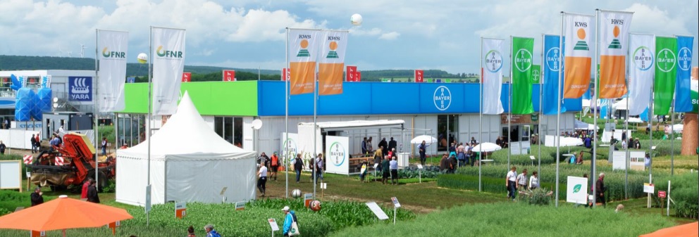 Die Feldtage der DLG (Deutsche Landwirtschafts-Gesellschaft) sind für ihre eindrucksvolle Leistungsschau des modernen Acker- und Pflanzenbaus bekannt. Neben der Präsentation von Saaten und Sorten werden alle zwei Jahre individuelle landwirtschaftliche Lösungen aus der Pflanzenzucht-, Dünger- und Pflanzenschutzmittelindustrie präsentiert. Unterschiedliche hochwertige Outdoor- und Eventzelte von Losberger dienten den Ausstellern als mobile Informationsstände mit individuellem Charakter und firmengeprägter Optik.Wobei hier nicht mehr von Zelten gesprochen werden konnte: Mit Fußboden, festen Wandelementen aus Glas oder Kunststoff oder großzügigen Gestaltungsflächen an den Außenfassaden wurden Raumkonzepte für den Messeauftritt geschaffen. Mehr als ein Jahr lang liefen die Vorbereitungen für die Schauparzellen rund um die aufwendig gestalteten Stände mit bis zu 1.000 m² Zeltfläche. Die Präsentationen der Ausstellerfirmen – darunter Bayer, Claas, Dow oder SKW – wurden ergänzt durch Fachvorträge in zwei Losberger Tagungszelten. Auch die Teilnehmer waren froh, hier zumindest zeitweise Schutz vor dem leider nicht besonders guten Wetter gefunden zu haben.