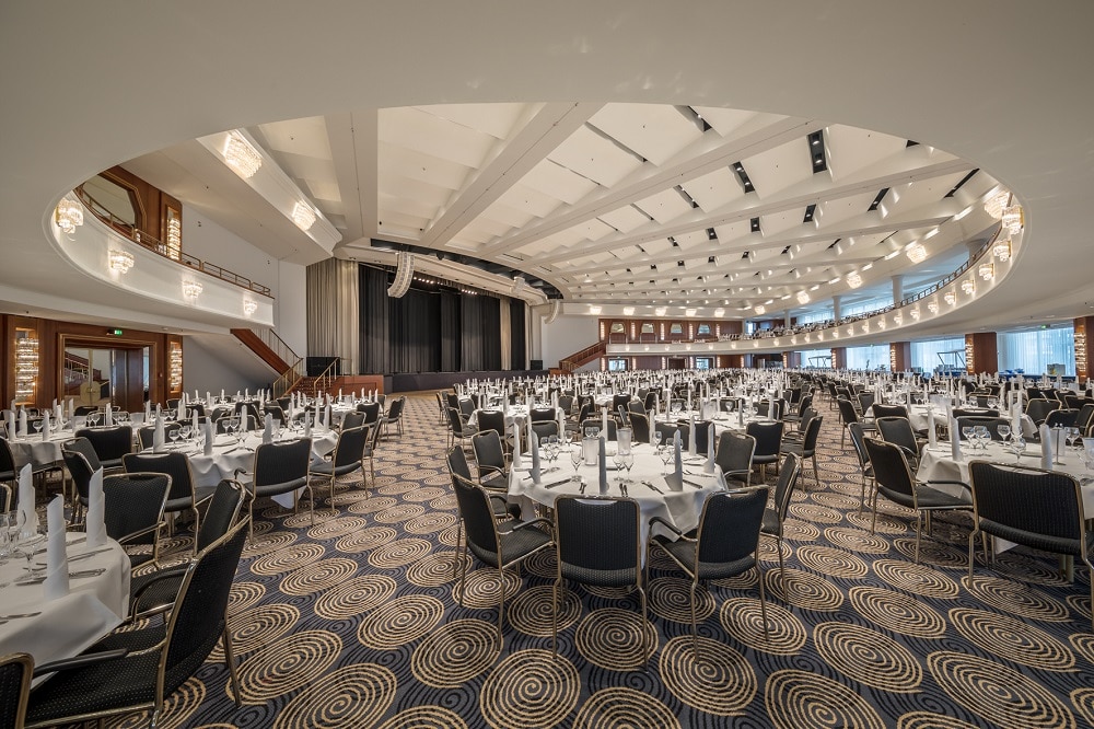 Der Saal Maritim mit großer eingebauter Bühne und L-Acoustics Beschallungsanlage (Bild: Teqsas GmbH )