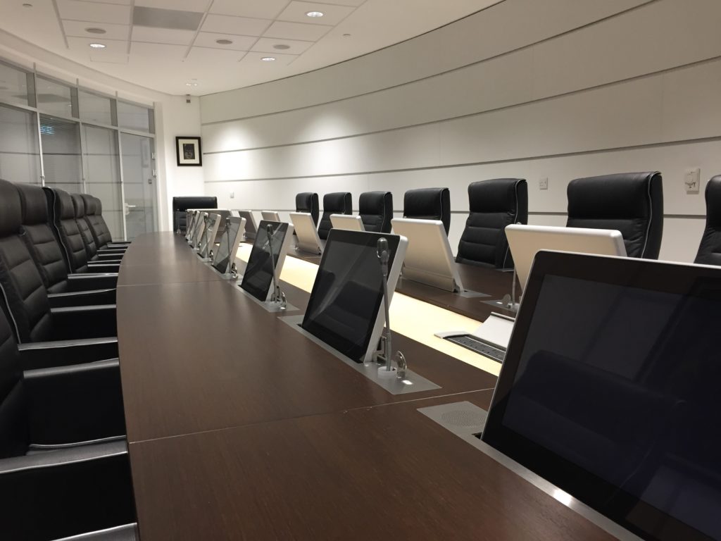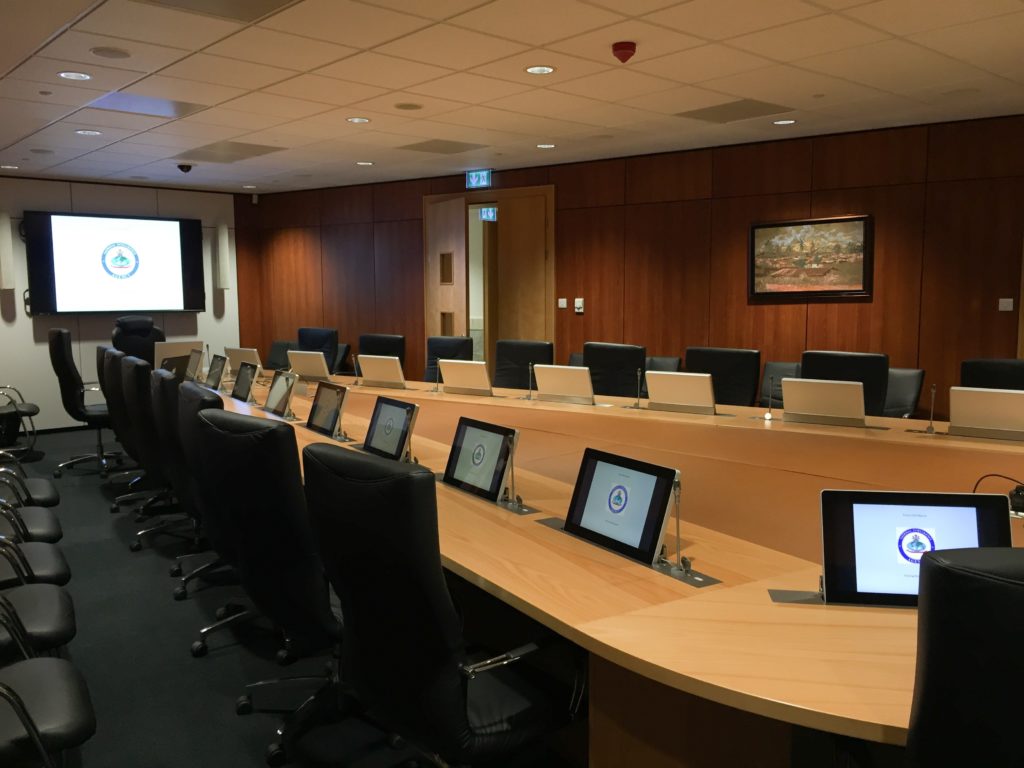 Für eine Regierungsbehörde in Abuja, Nigeria, vorinstallierte Kuchem Konferenz Technik über 287 Mikrofonsprechstellen mit versenkbaren 17“ Displays bereits im Lager. Nun wurde die umfangreiche Installation von dem Projektteam erfolgreich vor Ort abgeschlossen.