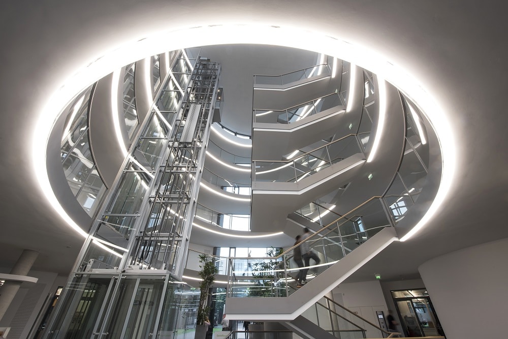 Die elliptische Grundform des Atriums stellte die Spezialisten von Erventec und Tridonic vor eine besondere Herausforderung. (Bild: Thomas Mayer)