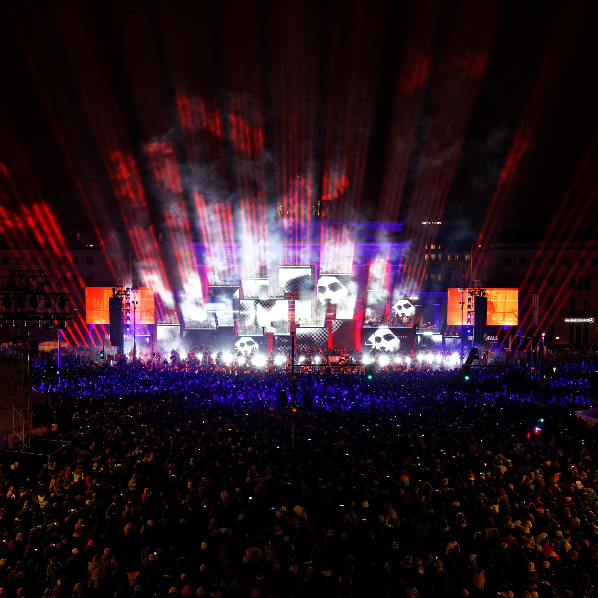 Somit erstreckte sich die Bühneninszenierung über vier Kilometer Länge durch die Stadt. Koordiniert vom italienischen Musikprojekt „Rocking 1000“ setzten 700 Berliner Musiker zeitgleich und absolut synchron auf allen Bühnen das musikalische Programm des Abends um und hüllten die Hauptstadt in eine Klangwolke.