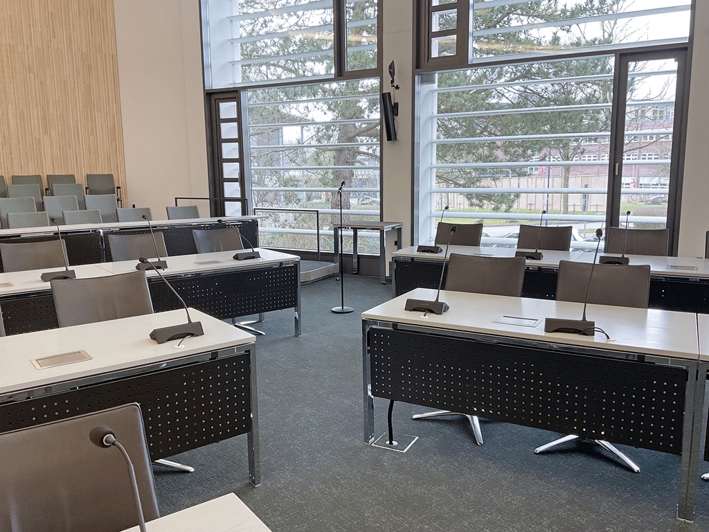 Bei der Modernisierung standen mehrere Herausforderungen im Raum. Die Akustik des Sitzungssaals musste verbessert werden, da die alte Technik häufig durch eine schlechte Audioqualität und Rückkopplungen zu Missverständnissen führte.
