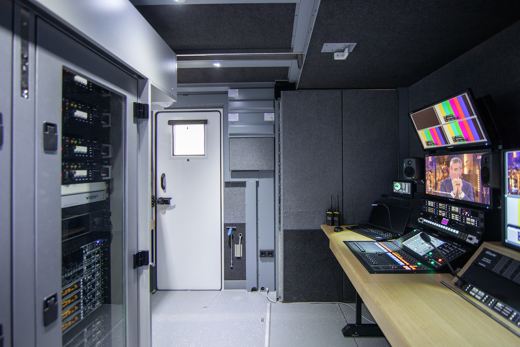 Mit zwei Ausschüben lässt sich der POD von 7,5 m2 auf 14m2 Fläche vergrößern und bietet im Einsatzmodus Raum für 4 Arbeitsplätze (1x Audio-Engineer, 1x Video Engineer, 2x Redaktion) inklusive zentralem Technikrack mit 2x 38HE. Im POD erfolgt das Monitoring der Video- und Audio-Signale der Kamera-Teams, die bei der Produktion im Einsatz sind, sowie die Steuerung der Intercom-Signale und der Motorola Funkstrecken. Während der Produktionen werden die Audio- und Videosignale direkt von der Rennstrecke via Darkfiber nach Salzburg ins Sendezentrum von Servus TV übermittelt und das Sendesignal erstellt. Das In-Ear Monitoring der Moderatoren, Reporter und der Kamera Teams wird im POD produziert, um Audio Delays zu vermeiden. Die Audiosignale, die in diesem Workflow anfallen, zeichnen sich durch eine große Heterogenität aus: Der POD sowie die WISYCOM Transmitter, die das Drahtlosnetzwerk über die Strecke hinweg realisieren, arbeiten mit digitalem Audio im Dante-Format. Die Signale der Intercom werden in AES67 verarbeitet und es fallen weitere analoge Audio-Signale aus den Office Containern an. Um eine reibungslose Konvertierung sicherzustellen sind mehrere PRODIGY Multiformat-Konverter von Directout in Stageboxen im Einsatz, die die Konvertierung von analog Audio und AES67 zu Dante und umgekehrt übernehmen. Im POD selbst dient eine digitale YAMAHA QL1 Audiokonsole mit DANTE-Integration zur Mischung der Signale. Als Kreuzschiene ist im POD Riedels MicroN-System im Einsatz. Die Steuerung der Audio und Video-Signale übernimmt das hi human interface Steuerungssystem von Broadcast Solutions.