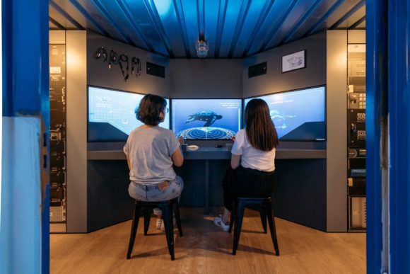 Forschungsgeräte begleiten die Besucher dabei. Sie treten einzeln – abgestimmt auf die Tauchfahrt – im Film wie im Raum hervor und verschwinden wieder in der Dunkelheit. Selbst aktiv werden die Besucher in einem begehbaren ROV-Control Container. Er dient der Suche nach Lebewesen im Dunkel der Meerestiefe und lässt sich virtuell steuern. Die Lebewesen können digital gesammelt, untersucht und klassifiziert werden. Live animiert entsteht immer wieder ein neues Erlebnis. Wichtig ist schnell zu sein, denn wenn die Luft ausgeht, startet ein neues Spiel. Auch der Tauchroboter Jago, ausgestellt als Nachbau, bietet die Möglichkeit der Interaktion: Seine Greifarme, Laser, Blitz und Scheinwerfer lassen sich über ein Steuerpult aktivieren. Das Licht fällt auf einen Quastenflosser, der sich im Nachbarraum befindet und zu diesem überleitet. Der Fisch, der zu den lebenden Fossilien zählt, lebt in einer Tiefe von 150 bis zu 400 Metern unter dem Meeresspiegel. Mit dem Jago wurde sein Lebensraum erforscht.