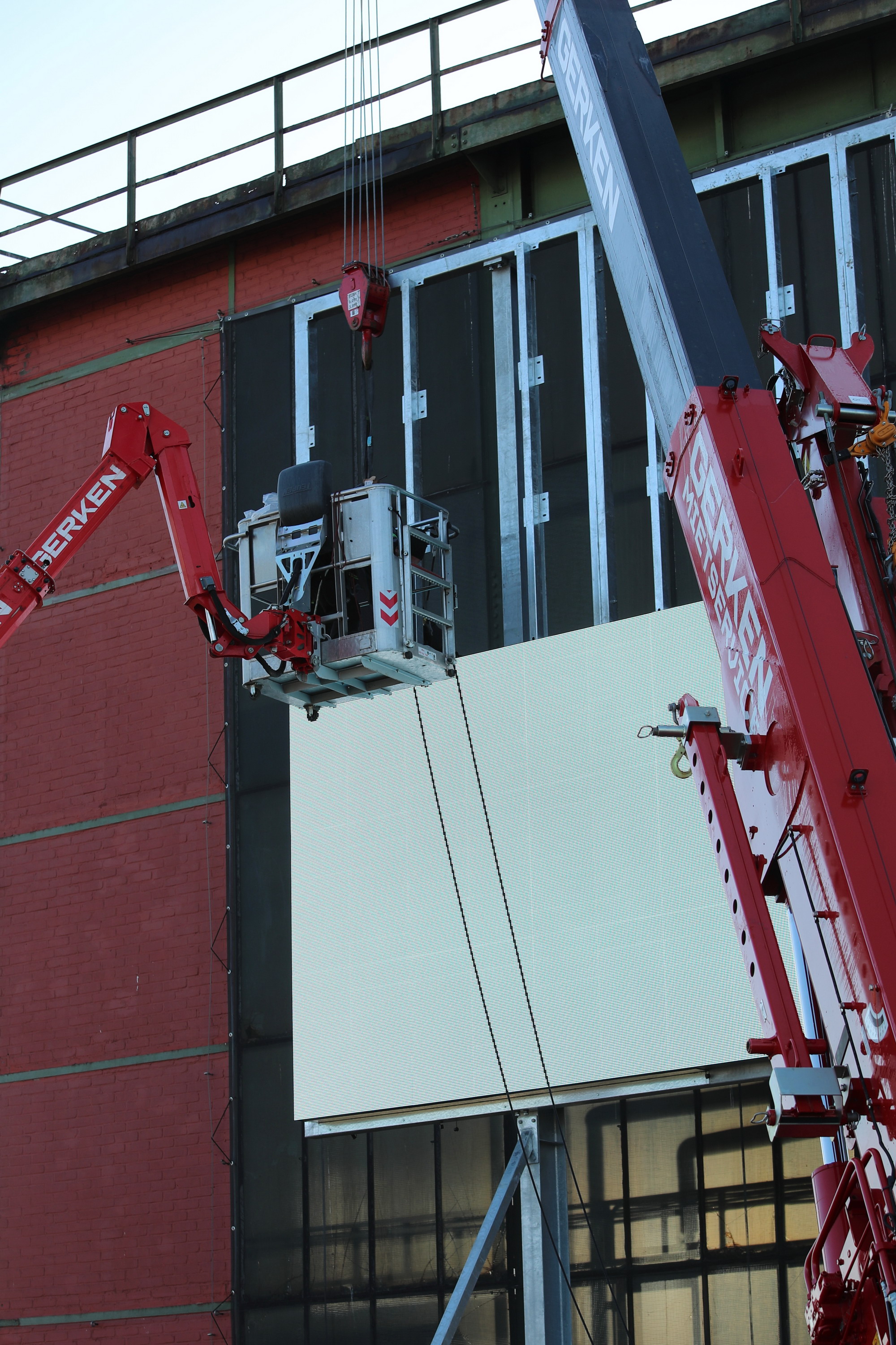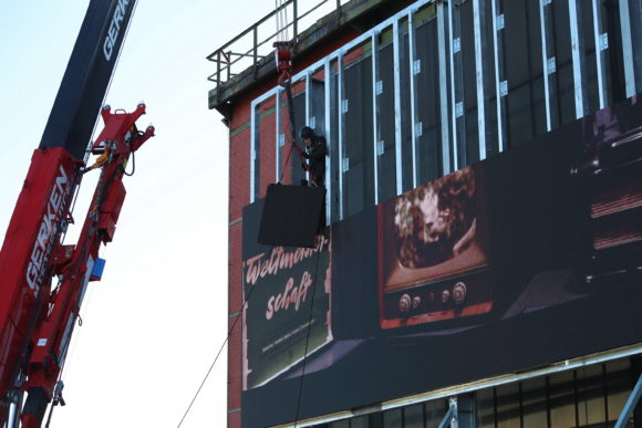 Kolja Birkenbach von Innlights berichtet: „Neben den Installationsarbeiten haben wir in der Planungsphase auch die Stahlhalterung konstruiert. Sie ist exakt abgestimmt auf die Maße und das Gewicht des Outdoor-Panels InnScreen F10 mit seiner leichten Alubauweise. Die Bildtechnik wiegt insgesamt nur 2 to. bei einer Displaygröße von 10,5 Metern Breite und einer Höhe von 5,8 Metern.“