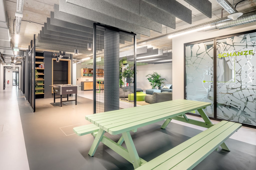 AppLike hat seit dem letzten Jahr nun eine Bestandsimmobilie mit 4.000m² bezogen und BAID hat die entsprechende Planung und den Ausbau übernommen. Im Detail seien die Bedürfnisse in dieser Branche etwas anders gelagert, aber worum es geht, sei identisch. So biete die Innenraumgestaltung Möglichkeiten, einen kurzen Break mit seinen Kolleg:innen zum Tischtennisspiel, Musik hören, Kochen, Abhängen oder für eine Yoga-Stunde. In der jüngsten Ausbaustufe des Unternehmens werde nun ein Fitnesscenter eingebaut.