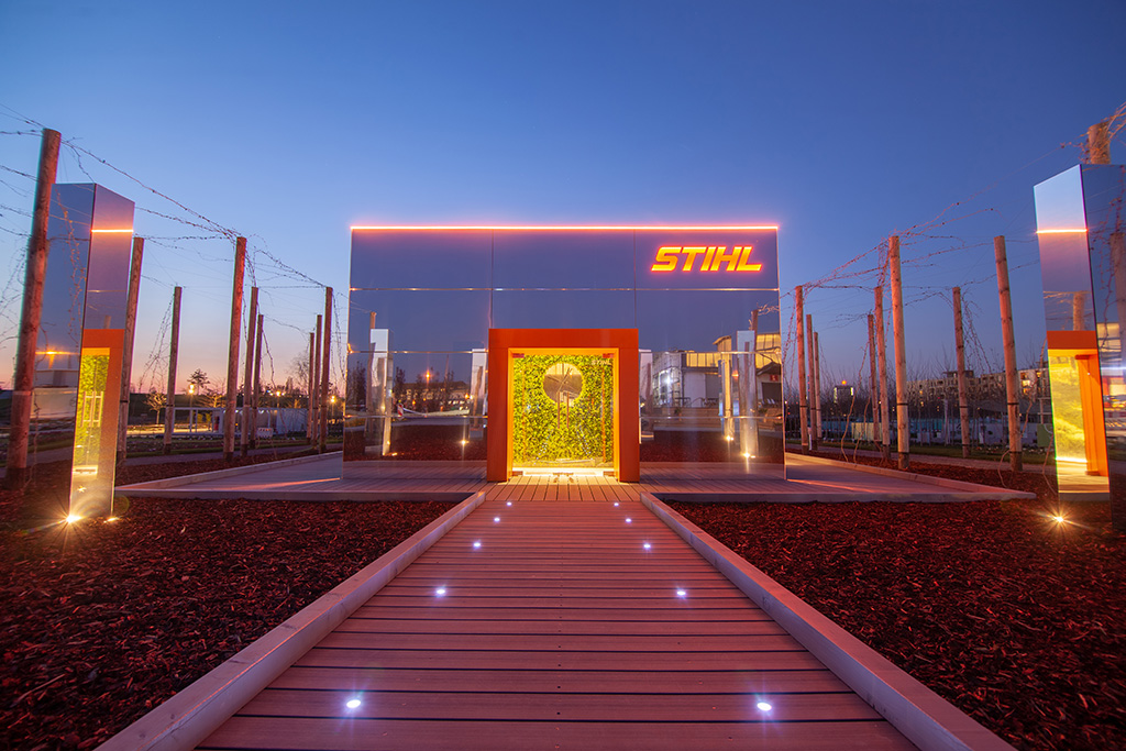 Mit Gerlinde Schlömer hat Nordlite bereits mehrfach zusammengearbeitet, so dass man sich als eingespieltes Team versteht. So konnte das Art Department die Ideen der Kreativdirektorin mit seinem langjährigen Know-how in den Bereichen Lichtdesign/-technik und Eventarchitektur tatkräftig unterstützen. Die entstandenen Lichtstimmungen wecken Emotionen und sollen dem Besucher nachhaltig im Gedächtnis bleiben. Im Inneren des Stihl-Kubus befindet sich das markentreu inszenierte Ausstellungsareal. Der Eintritt in den Pavillon führt in die Stihl-Welt, die mittels Großflächen, interaktiven Displays mit dahinter gelagerten Produkt- und Unternehmensinformationen und klassischen, gartentypischen Szenarien aufwartet. So wurde ein Geräteschuppen mit technischen Raffinessen inszeniert und ein Gartenzaun, der Einblicke in den Garten dahinter gewährt. In Schaukästen tun sich Miniaturgartenwelten auf.