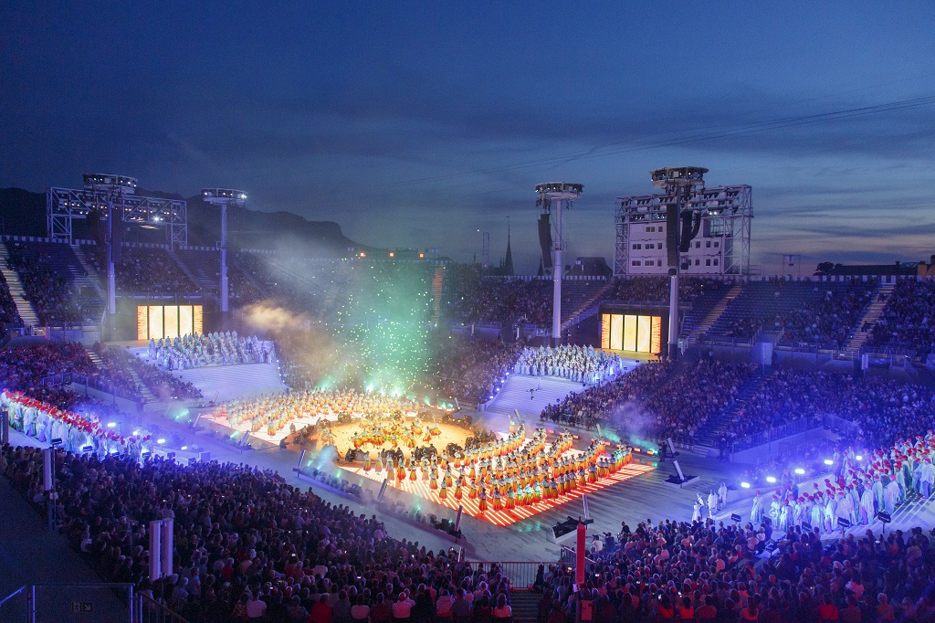 Dabei überzeugt die Arena auch dank der Tribünenanlage auf einem Stahlträgerrost in knapp sechs Meter Höhe. „Die Zuschauer auf dem obersten Rang befinden sich auf fast 20 Meter über dem Boden“, sagt Peter Tanner, COO Events Nüssli Gruppe und ergänzt: „Sie genießen damit eine uneingeschränkte Sicht auf das Geschehen auf der Bühne. Für uns allerdings bedeutete diese Spezialkonstruktion eine Herausforderung für die Montage und sie erforderte eine absolut durchdachte Materiallogistik.“