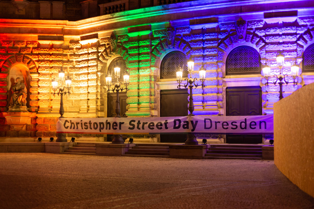 Dirk Preuß vom Produktionsbüro Dresden wurde im Rahmen der Planungen damit beauftragt, bekannte Dresdner Gebäude in den Regenbogenfarben der Bewegung zu illuminieren.