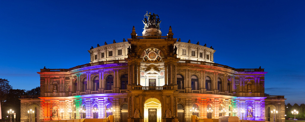 Mit Hilfe von insgesamt 36 Litecraft OutLED AT10 plus wurden anlässlich des Internationalen Tages gegen Homophobie sowohl die weltberühmte Semperoper als auch das Dresdner Rathaus in bunte Farben getaucht und setzten so ein Zeichen für ein buntes Dresden.