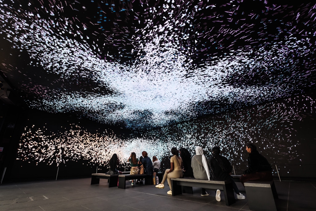 Die Besucher:innen von Outernet können ab sofort in einem öffentlichen Atrium eine multisensorische Installation erleben: Now Building verfügt über eine digitale Leinwand, die sich über vier Stockwerke, vom Boden bis zur Decke reichend, als 360°-Bildschirmfläche mit 16K-Auflösung erstreckt. Die Medieninstallation beträgt 2.100m². Die Technik der multimedialen LED-Umgebung mit 4D- und Interaktionsfähigkeiten bietet Möglichkeiten für visuelle Inszenierungen und Storytelling.