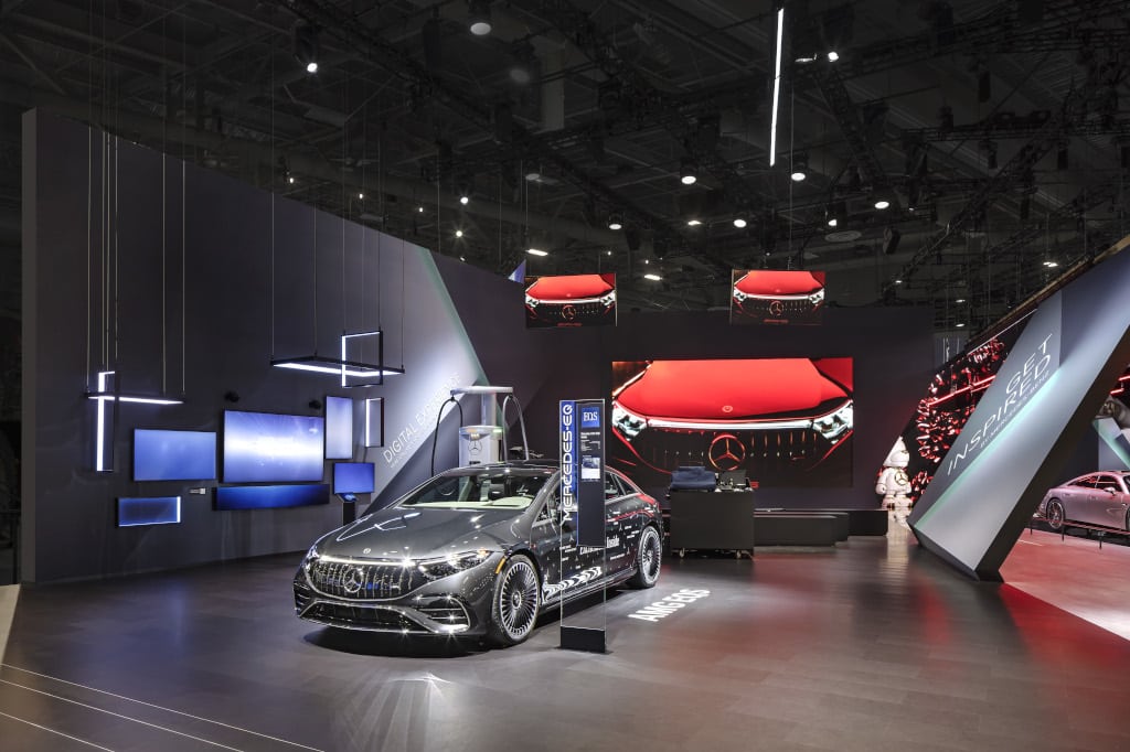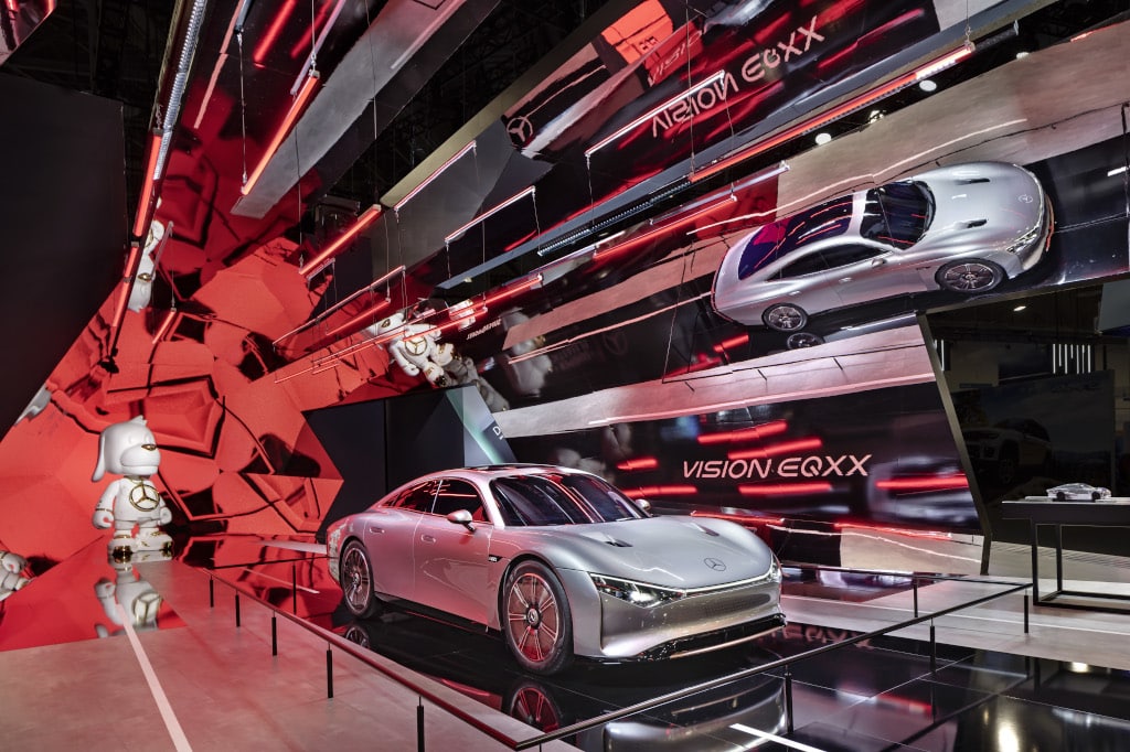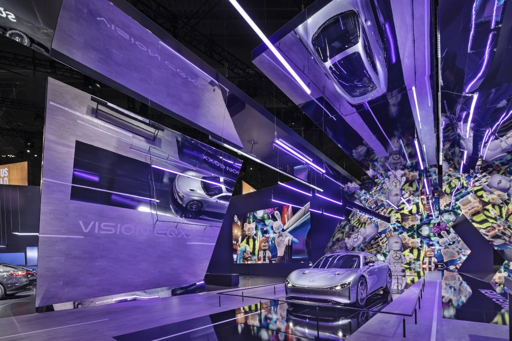 Auf einer Ausstellungsfläche von knapp 1.000m² präsentierte Mercedes-Benz unter dem Motto „Tech to Desire“ eine Reihe Produkten wie das High-Power-Charging-Netzwerk, ein lebensgroßes Modell des Vision EQXX sowie Kooperationen mit Apple Music und ZYNC. Für die Umsetzung inklusive der Herstellung und des Aufbaus des Messestandes benötigte Raumtechnik fünf Wochen.