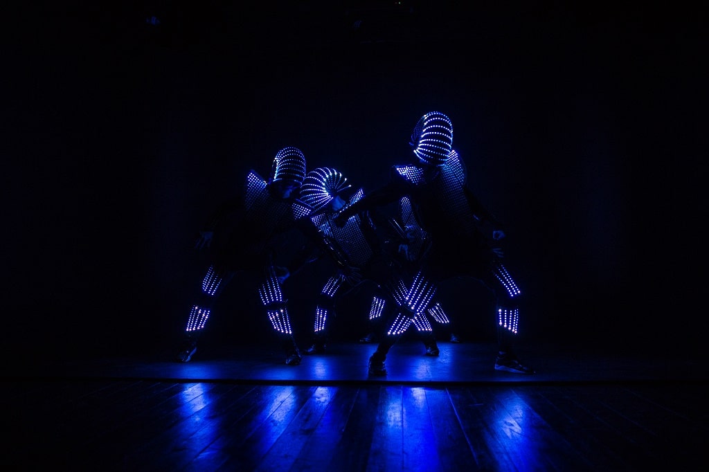 Zwei Performer symbolisieren dabei den von Technik umgebenen Menschen im Arbeitsprozess. Die Darsteller sind am Körper mit LED-Dioden ausgestattet, Kopf und Gesicht bleiben jedoch sichtbar. Zwei weitere Akteure agieren als digitales Abbild (Digital Twin) und werden dem entsprechend entmenschlicht und futuristisch mit einem Ganzkörperanzug inklusive Helm dargestellt.
