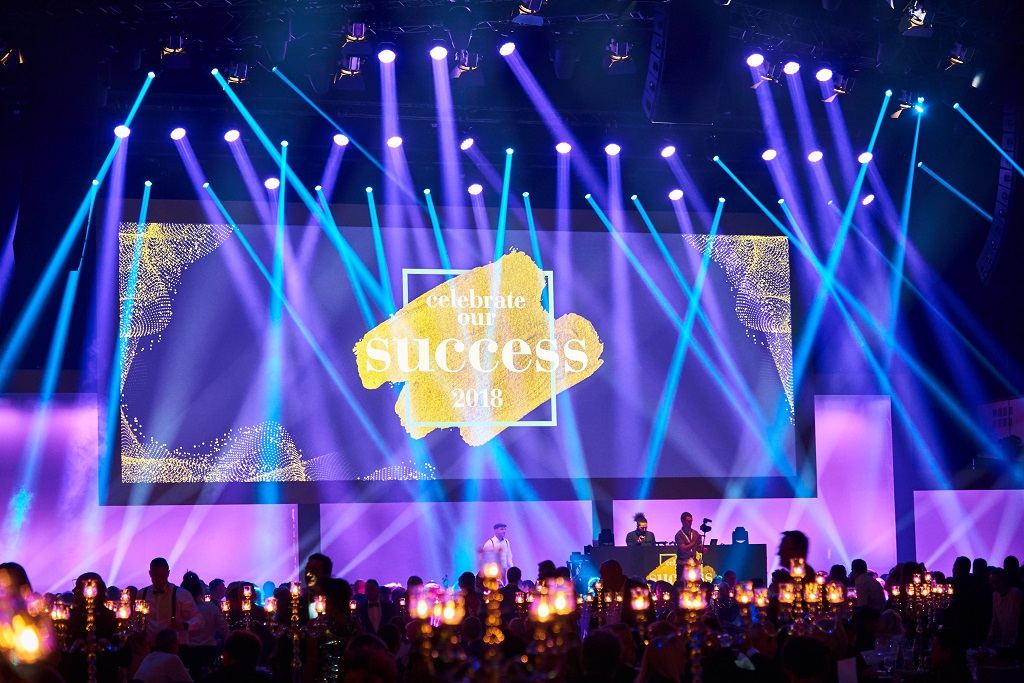 Auf der Bühne wurden nicht nur die Erfolge des Unternehmens gefeiert und Ehrungen vorgenommen. Als Show-Act gab es nicht weniger als “Michael Jackson – The Symphony Experience”. Mit großem symphonischem Aufgebot wurde der King of Pop zum Leben erweckt – in einer Melange aus klassisch anmutenden Arrangements, Funk und Soul. Dazu wurde die Bühne während der Veranstaltung in nur 30 Minuten umgebaut. Die komplette Orchester-Backline wartete bereits auf Roll-Risern hinter der Bühne – bis der Weg mittels einer verfahrbaren Wand freigemacht und das gesamte Orchester-Set just in time nach vorne gerollt wurde. So ging auch die Show reibungslos über die Bühne und das Publikum konnte das orchestrale Ereignis in allen akustischen und optischen Facetten genießen.