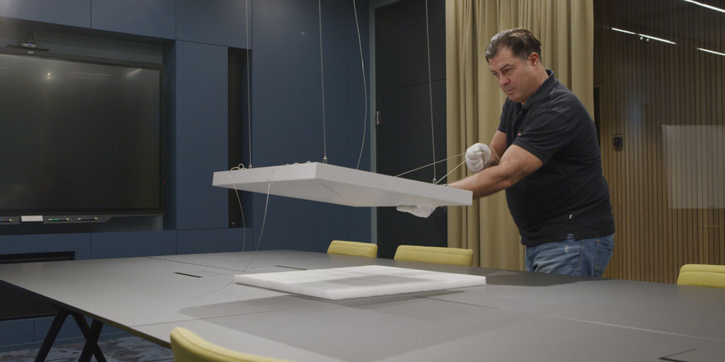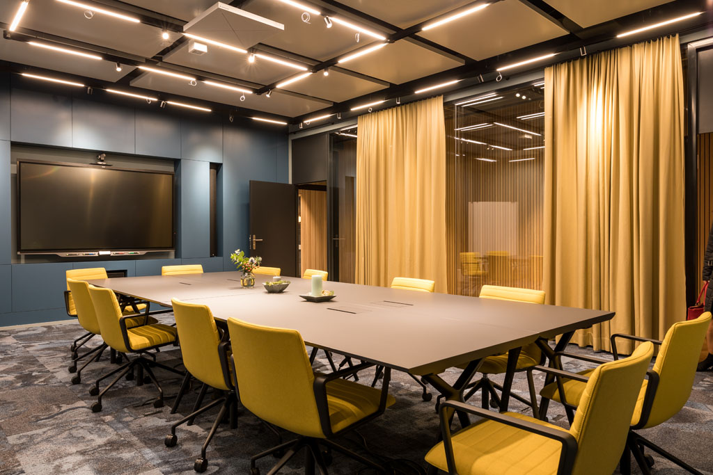 Der Konferenzraum ist mit Videokonferenztechnik ausgestattet. Dazu gehört neben Kamera, Bildschirm, Codec und Linienstrahler-Lautsprechern auch ein Sennheiser TeamConnect Ceiling 2, das in der Mitte des Raums von der mit zahlreichen Leuchten versehenen Decke abgehängt ist. Geliefert, installiert und eingerichtet wurde das Sennheiser Deckenmikrofon von der Schweizer Supravision AG.