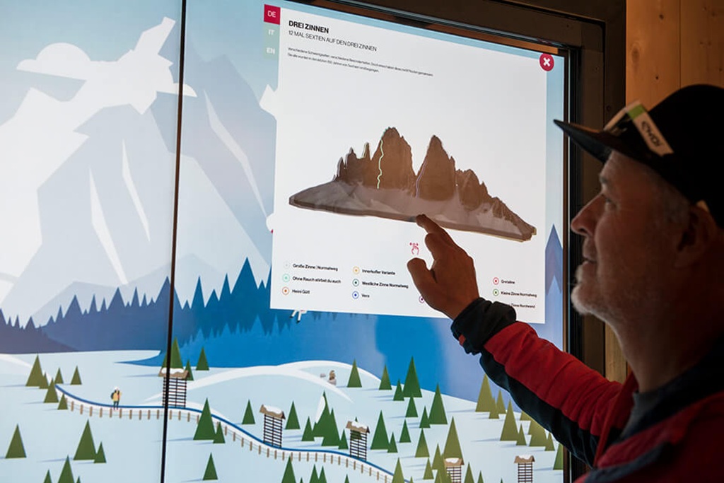 Ein besonderes Highlight ist die Drag-and-Drop Funktion: Wird zum Beispiel ein Skifahrer-Symbol auf eine Piste gezogen, erscheinen sofort detaillierte Informationen zur Aktivität. Die Besucher können die Geschichte der Region über eine animierte Galerie regionaler Persönlichkeiten und Biografien erleben. Eine interaktive Zeitleiste ermöglicht es, durch die wichtigsten Etappen der Sextner Vergangenheit zu scrollen, während in der 3D-Ansicht Landschaften und Wanderwege mit Touch-Gesten interaktiv gedreht und gezoomt werden können.