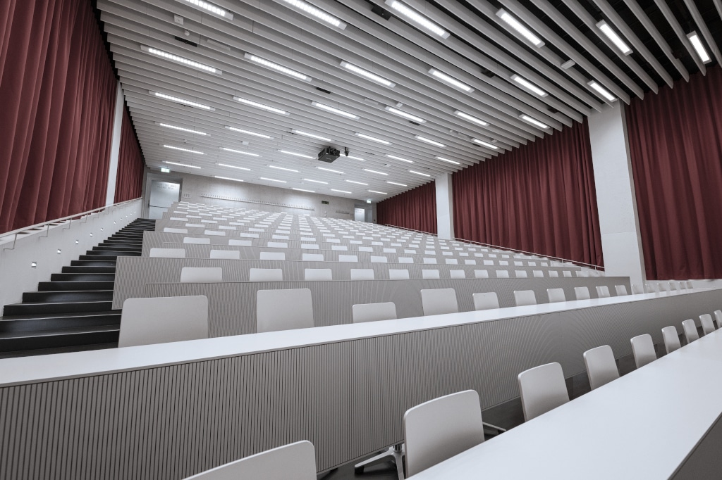 Neben den Podcast-Räumen, die seit 2017 realisiert wurden, folgte 2022 das 365 Personen umfassende Robert-Köchlin-Auditorium, das für hybride und digitale Vorlesungen ausgestattet wurde. Dafür wünschte man sich ein zuverlässiges sowie intuitiv bedienbares Konferenzsystem, um ein möglichst einfaches Bedienerlebnis zu bieten.