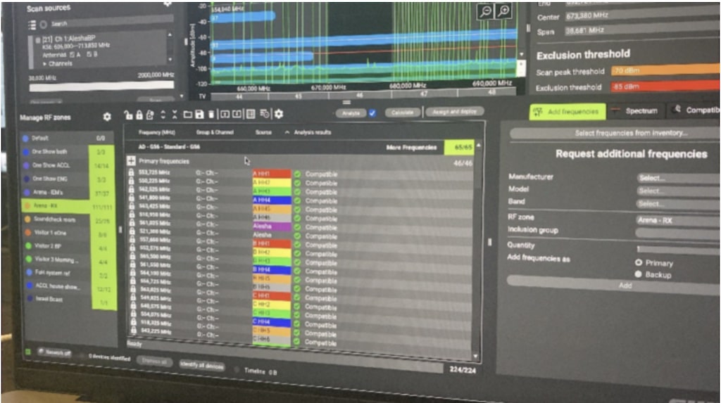 Josh Lloyd, Leiter der Technikabteilung bei Britannia Row, erklärt: „Axient Digital hat uns bei der Verwaltung des Spektrums geholfen und es uns ermöglicht, viele Kanäle in ein begrenztes Spektrum zu drücken. Wir hatten zehn oder zwölf ShowLink Access Points in der gesamten Arena, und das bedeutete, dass wir die Kontrolle über die Handsender hatten, die von allen Künstlern und Künstlerinnen in allen Bereichen verwendet wurden.“