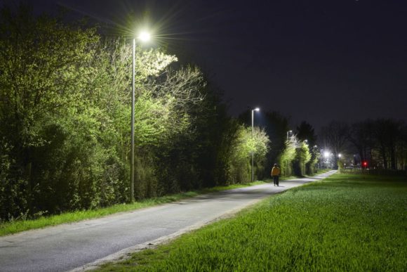 Funkmodule vernetzen die Leuchten untereinander und geben das Signal weiter, so dass der gesamte Straßenzug ausgeleuchtet wird. Von der adaptiven Beleuchtung profitieren die Bürger und die Umwelt gleichermaßen. Für die Passanten gewährleistet sie ein hohes Maß an Sicherheit: Das Licht reagiert auf sie und gibt ihnen damit augenblicklich ein persönliches Sicherheitsgefühl. Dank des Abdimmens der Beleuchtung und der Reaktion auch auf minimale Tageslichtveränderungen reduziert sich die Lichtüberflutung deutlich – ein großer Vorteil für die Umwelt, Tiere und Pflanzen, die andernfalls durch das künstliche Licht gestört würden.