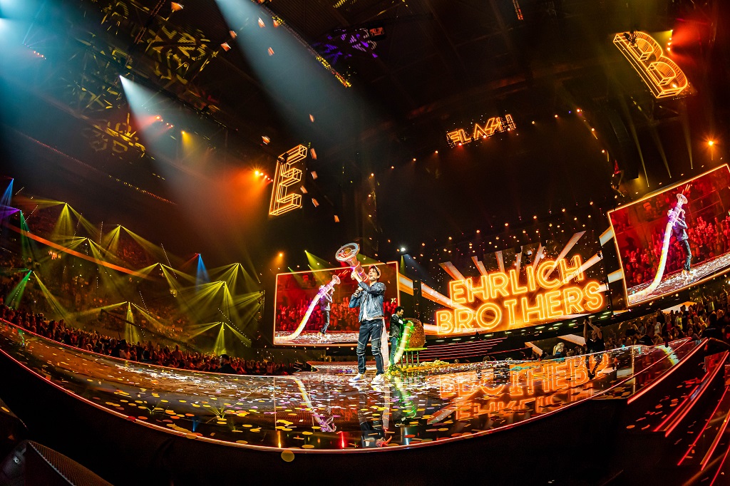Spannende Zaubertricks, drei Weltrekorde und eine tolle Pyro- und Lichtshow lieferten die Ehrlich Brothers am 15. Juni 2019 in der Düsseldorfer Merkur Spiel-Arena ab. Unterstützung bei der Umsetzung von „Flash – Die Stadionshow“ auf einer 60 mal 20 Meter großen Bühne erhielt das magische Duo von Stageco Deutschland.