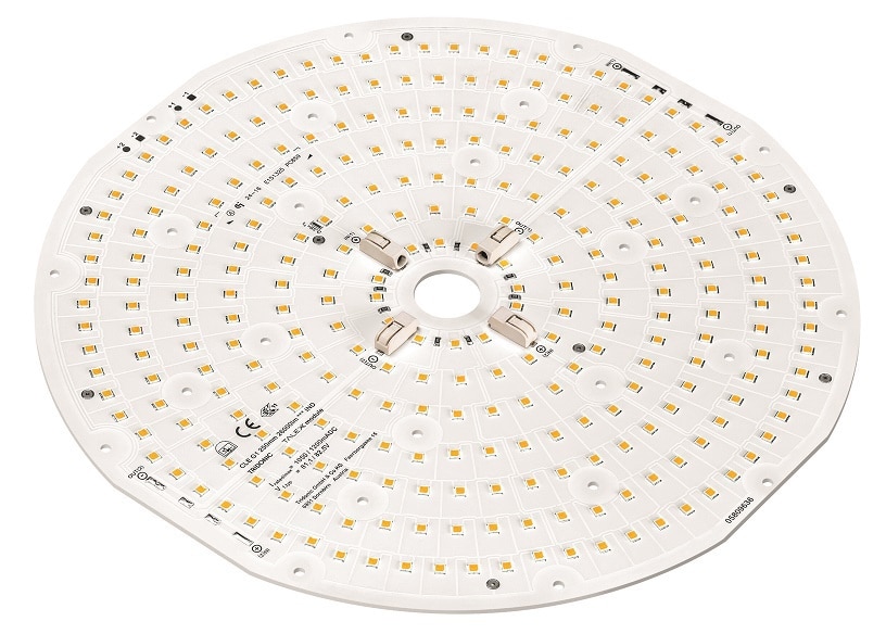 Tridonic führt für derartige Anwendungen die Vorteile des Indoor-Segments mit jenen der Outdoor-Produkte zusammen. So entstehen LED-Lösungen mit hoher Effizienz, niedrigen Standby-Verlusten und erhöhter Spannungsfestigkeit für erweiterte Temperaturbereiche. Als vollwertiger Ersatz für Fluoreszenz- und HID-Leuchtmittel erfüllen die LED-Module die Anforderungen der Industriebeleuchtung. Die CLE Module in runder Bauform sorgen für homogene Ausleuchtung. Sie sind zum Beispiel für den Einsatz in Wandleuchten geeignet. Die quadratische Bauform QLE eignet sich auch für Deckenleuchten.