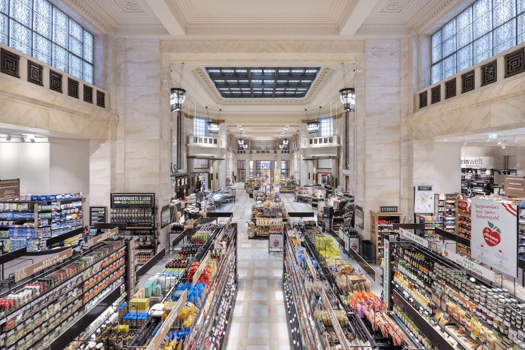 Die Hochformat-Screens im Kassenbereich seien eines der Digital-Signage-Highlights im Interspar-Hypermarkt am Schottentor in Wien. Im bislang kleinsten Interspar-Standort in einem denkmalgeschützten, ehemaligen Bankgebäudes inszeniert der Lebensmittelkonzern das Omnishopping – Einkaufen als Erlebnis für alle Sinne. Über drei Jahre hinweg wurde geplant, restauriert, umgebaut. Vor allem bei den Themen „Hören“ und „Sehen“ setze Interspar auf digitale Komponenten. Ein integriertes Audiosystem mit 92 Lautsprechern trifft auf eine Bilderwelt aus 14 Screens. Menue Boards in der Market Kitchen zeigen aktuelle Informationen. Displays vernetzten die Backstube mit dem Backshop.