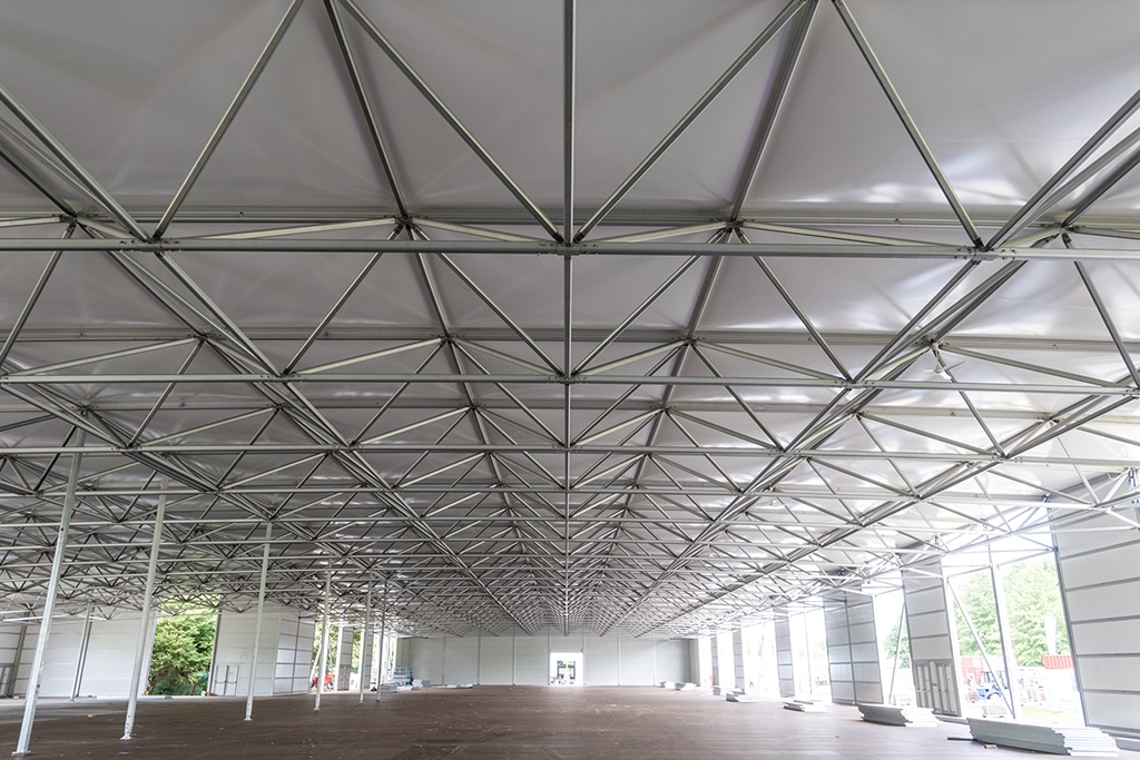 Noch im Aufbau – in dieser etwa 9 Meter hohen Halle werden während der Weltklimakonferenz die Länderpavillons zu finden sein. (Bild: VAGEDES & SCHMID / Dominik Ketz )
