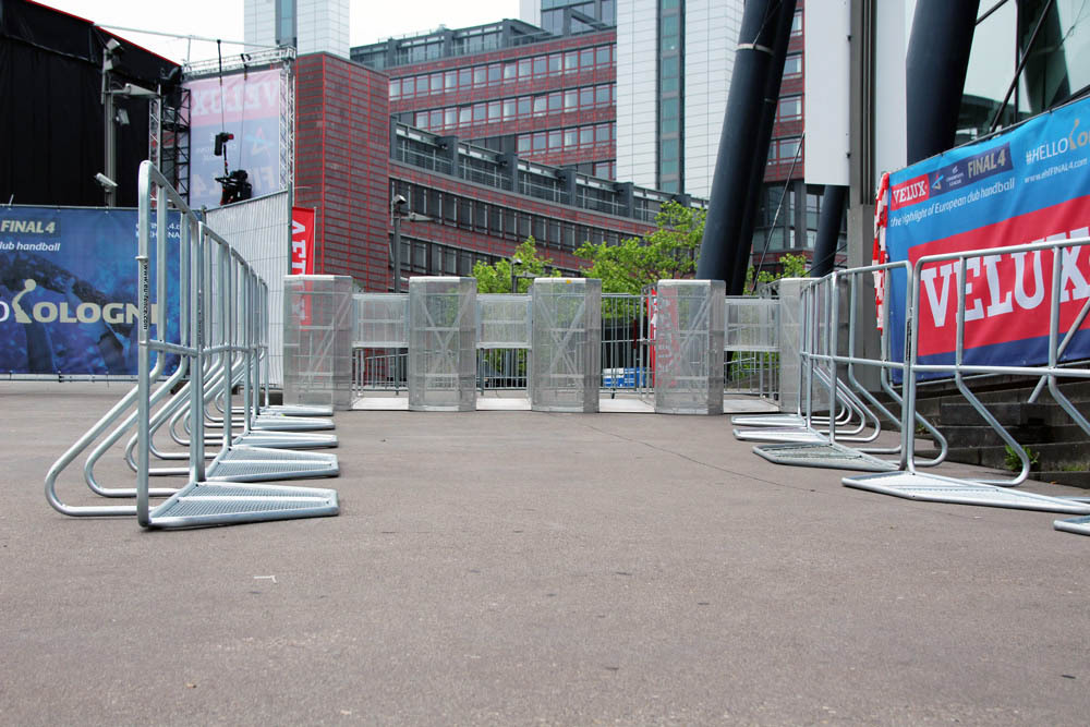 Der Infrastrukturdienstleister EPS lieferte und verbaute Absperrsysteme wie Polizeigitter, Mannesmanngitter und Mobilzäune mit Sturmstreben. Fluchtwegbeschilderung sorgte für eine sichere Wegeführung. Um den Zuschauerstrom der Handballfans in die richtigen Bahnen zu lenken, wurden GIGS Einlassschleusen aufgestellt. Remopla, der robuste Bodenbelag, garantierte zuschauerfreundliche Wege zum Einlass. Am Tag vor den ersten Spielen stieg vor der Arena die große Eröffnungsparty. Rund um eine Open-Air-Bühne wurden GIGS Bühnenbarrikaden aufgebaut, die den Bühnenbereich sicherten und ab 18 Uhr ging es nicht nur um Handball, sondern es gab auch viel kölsche Musik.